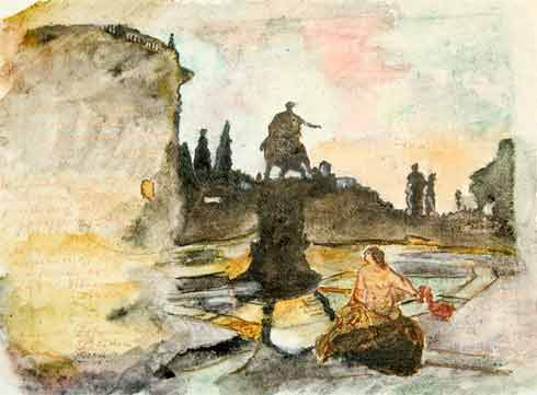 Sie trug den Becher in der Hand - ihr Kinn und Mund glich seinem Rand - so leicht und sicher war ihr Gang, kein Tropfen aus dem Becher sprang. So leicht und fest war seine Hand: er ritt auf einem jungen Pferde, und mit nachlässiger Gebärde erzwang er, daß es zitternd stand. Jedoch, wenn er aus ihrer Hand den leichten Becher nehmen sollte, so war es beiden allzu schwer: denn beide bebten sie so sehr, daß keine Hand die andre fand und dunkler Wein am Boden rollte.